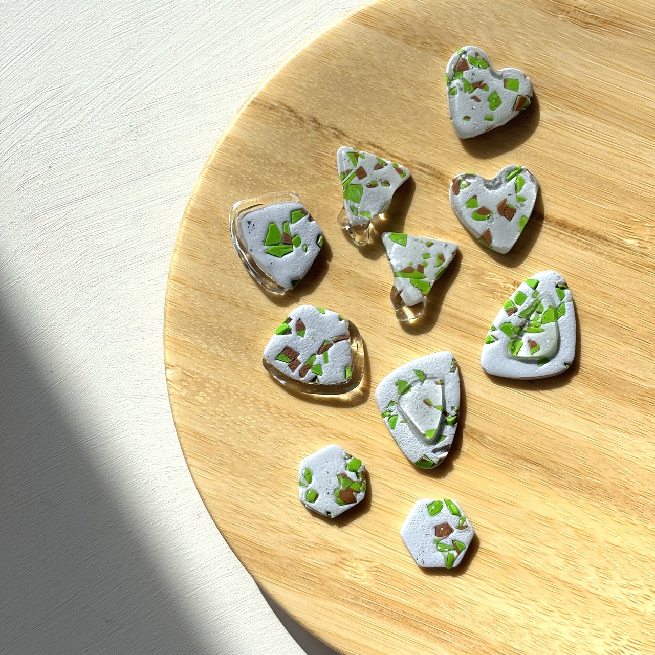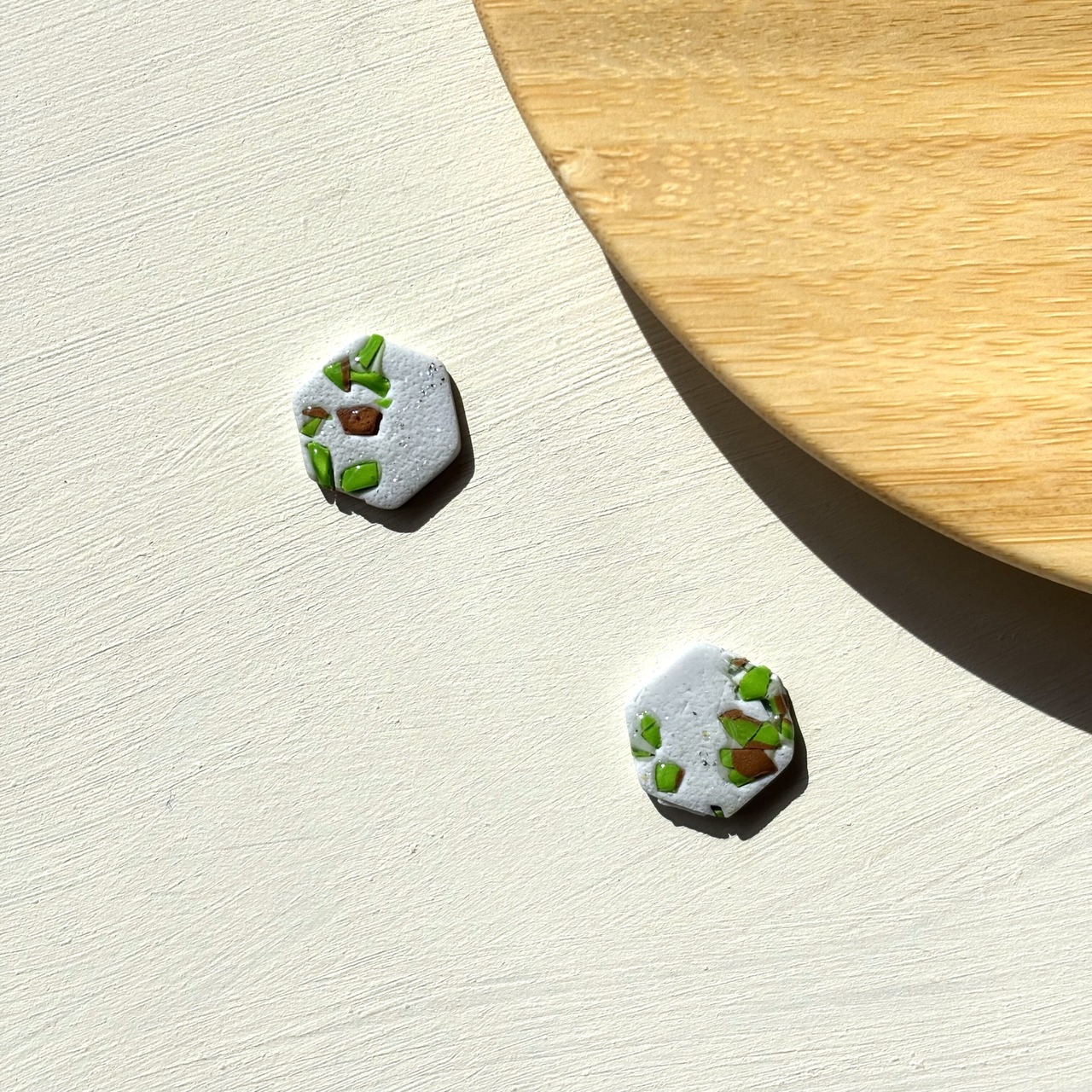 エンボス(凸凹)加工にクレイのカラーフレークをちりばめて